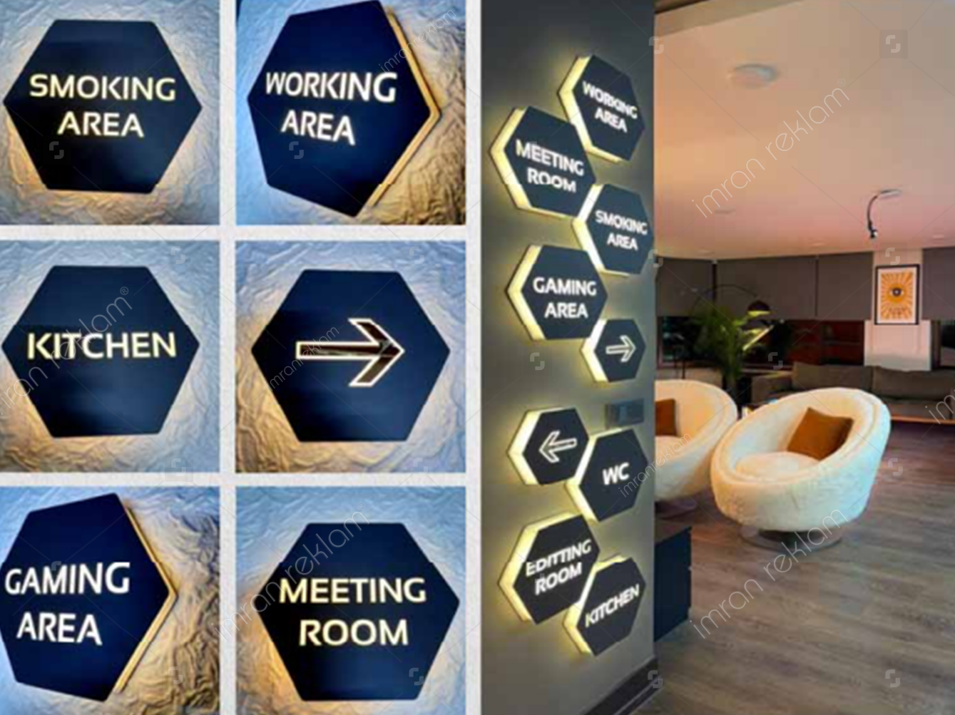 - Şık ve Modern Tasarım: Altıgen şekli, sıradan yönlendirme tabelalarından farklı olarak, mekâna şıklık katar. Modern bir atmosfer yaratmak isteyen işletmeler ve kurumlar için ideal bir tercihtir.