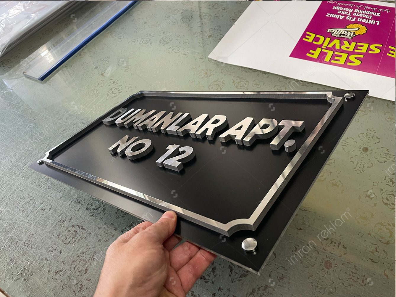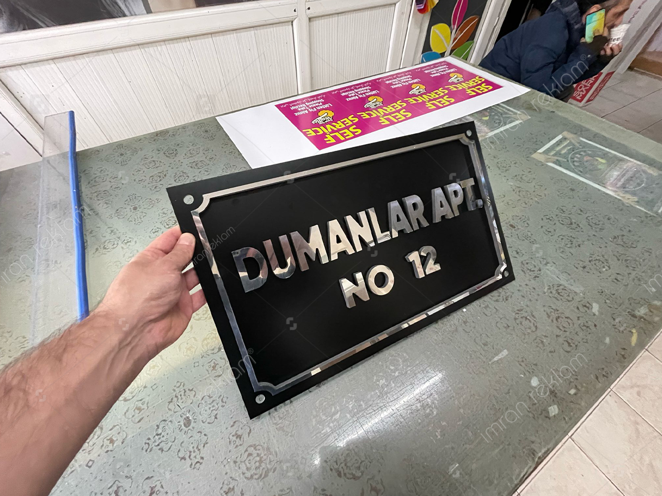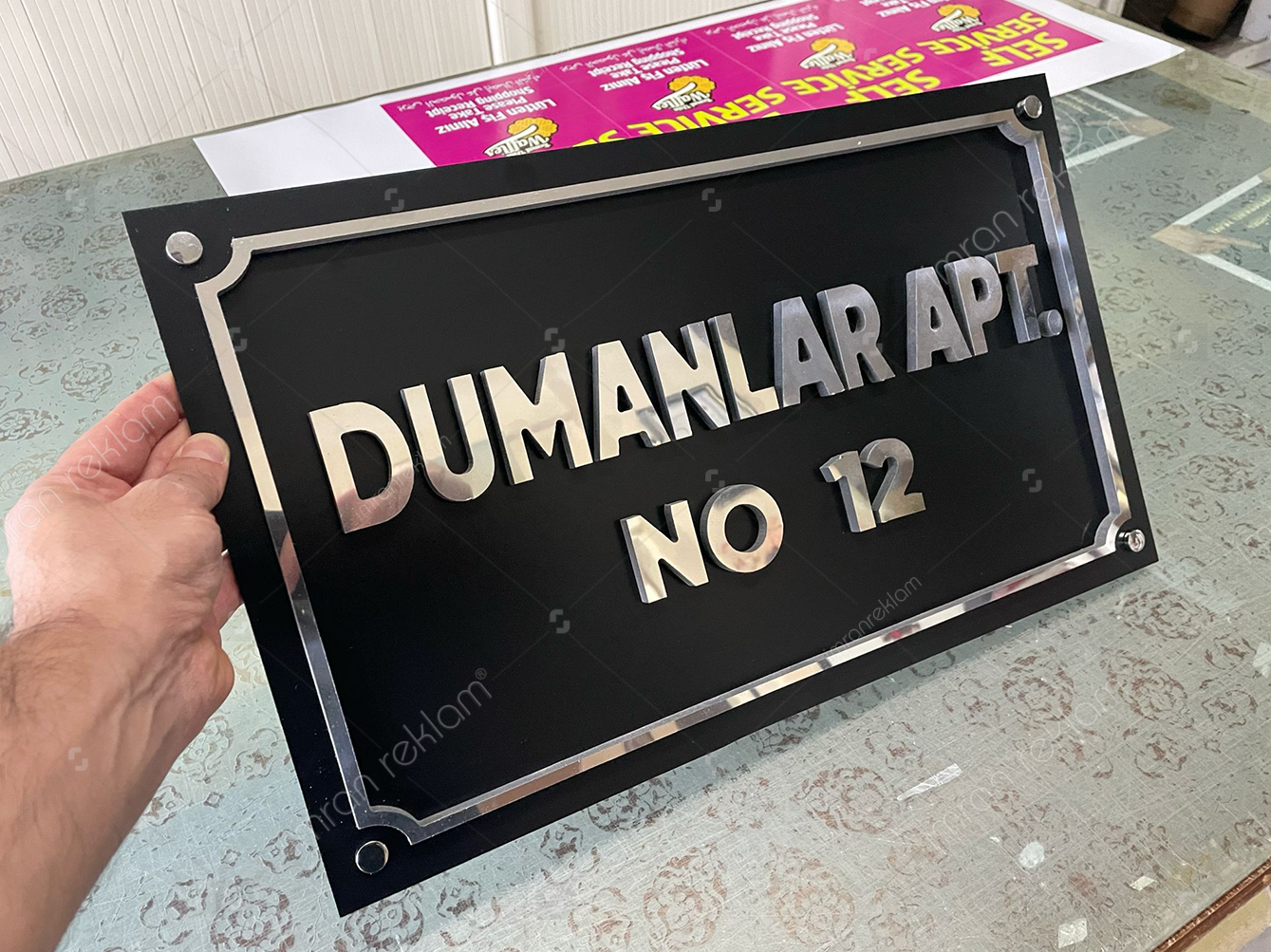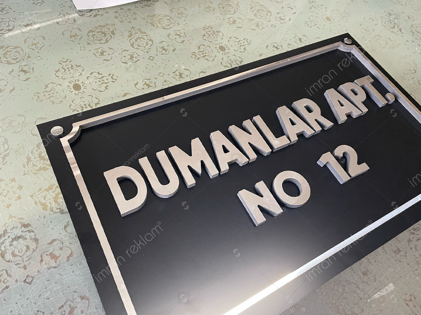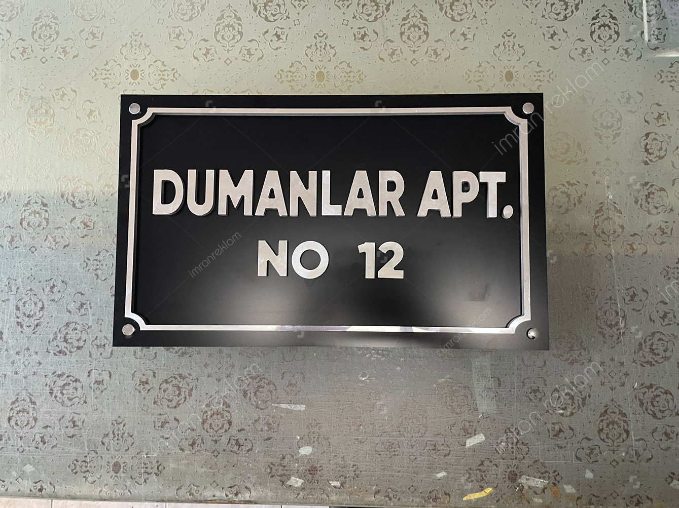 Dumanlar Apartmanı Kabartma Harf Tabela, apartmanınıza zarif ve estetik bir dokunuş katmak için ideal bir üründür. Bu tabela, apartmanınızın adını ve numarasını göstererek hem estetik açıdan hoş bir görünüm sağlar hem de apartmanınızın daha kolay bulunmasını kolaylaştırır.