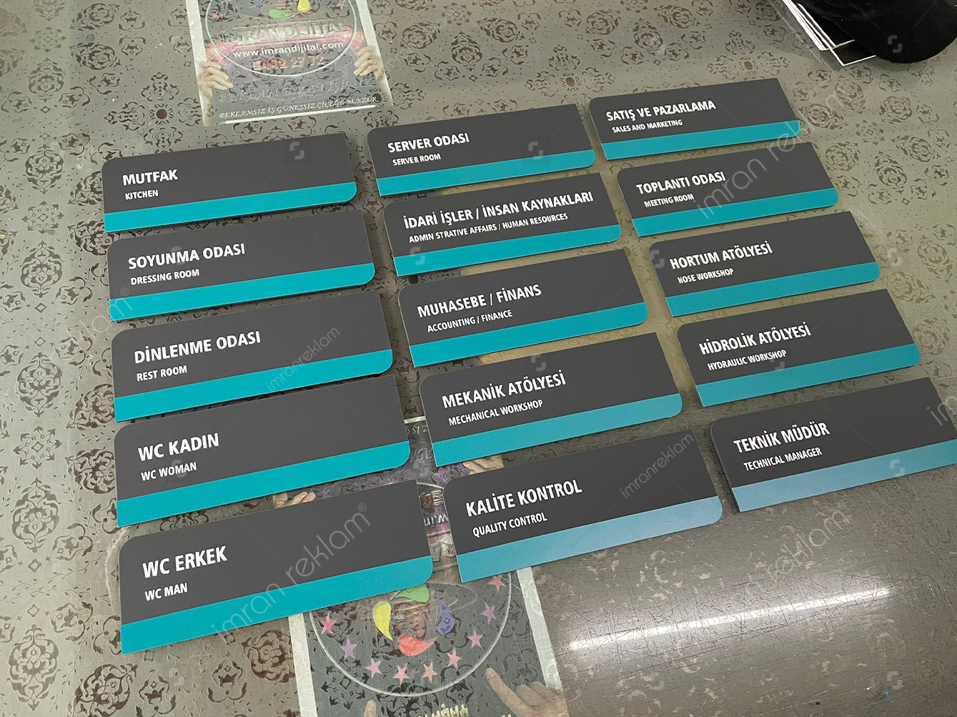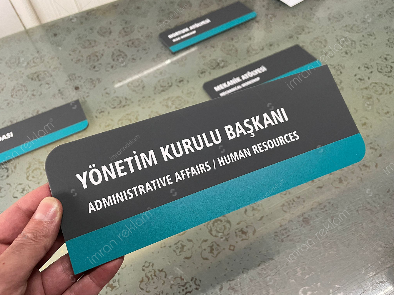 - Basit: “Yönetim Kurulu Başkanı (İdari İşler/İnsan Kaynakları)” veya “Administrative Affairs/Human Resources” yazısı içeren, düz renk bir tabela.