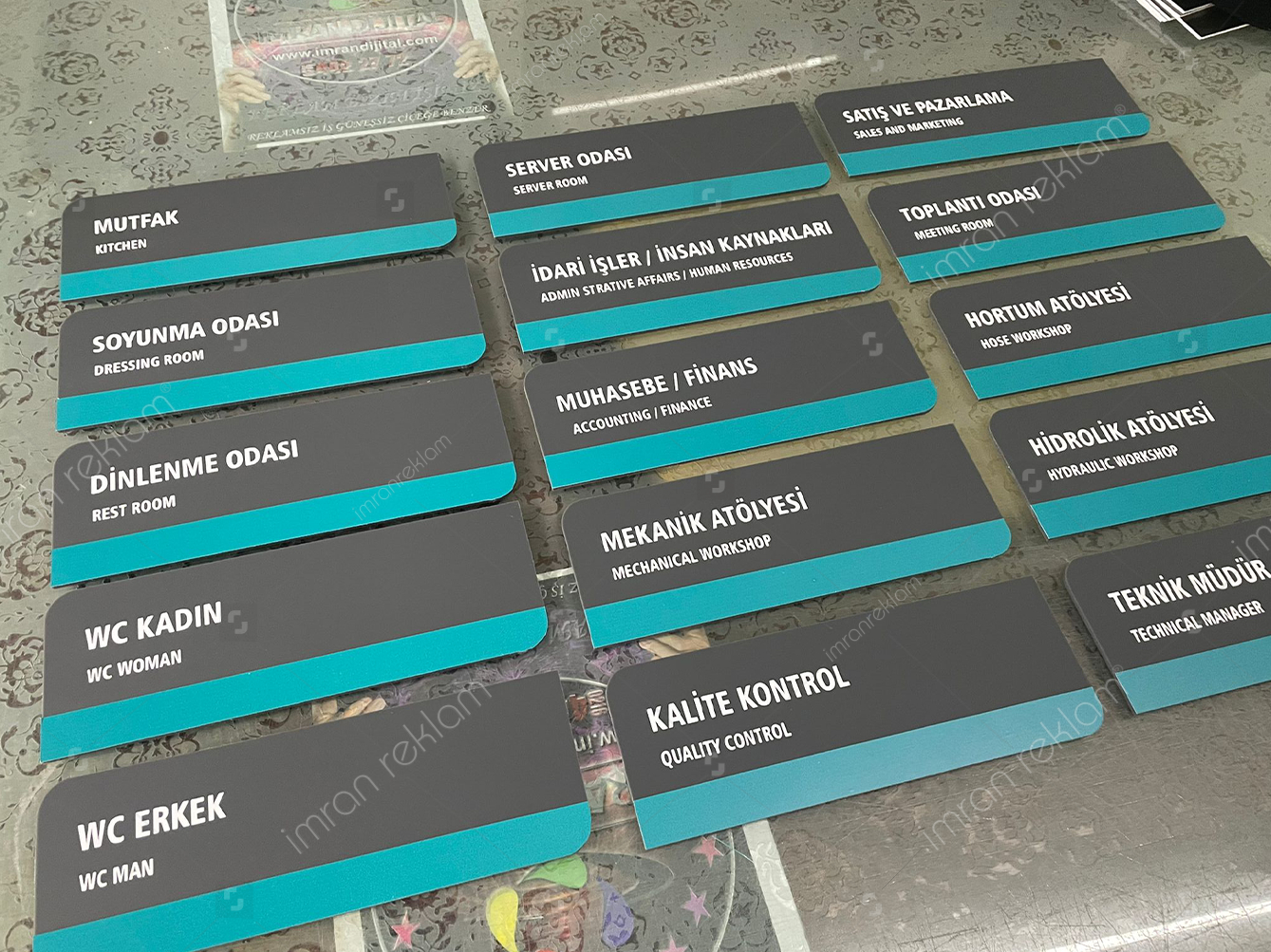 - Standart: “Yönetim Kurulu Başkanı (İdari İşler/İnsan Kaynakları)” veya “Administrative Affairs/Human Resources” yazısının yanı sıra, departmanın iletişim bilgilerini içeren bir tabela.